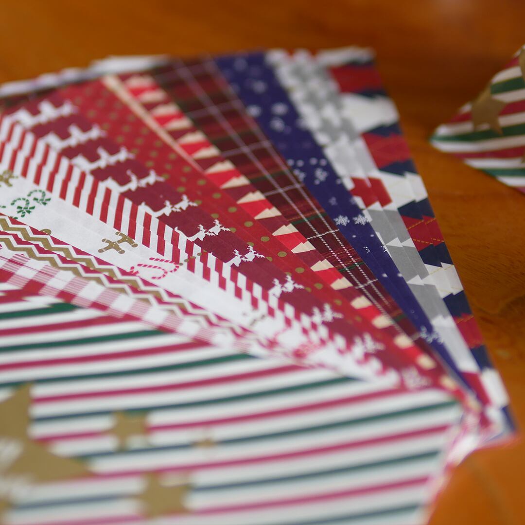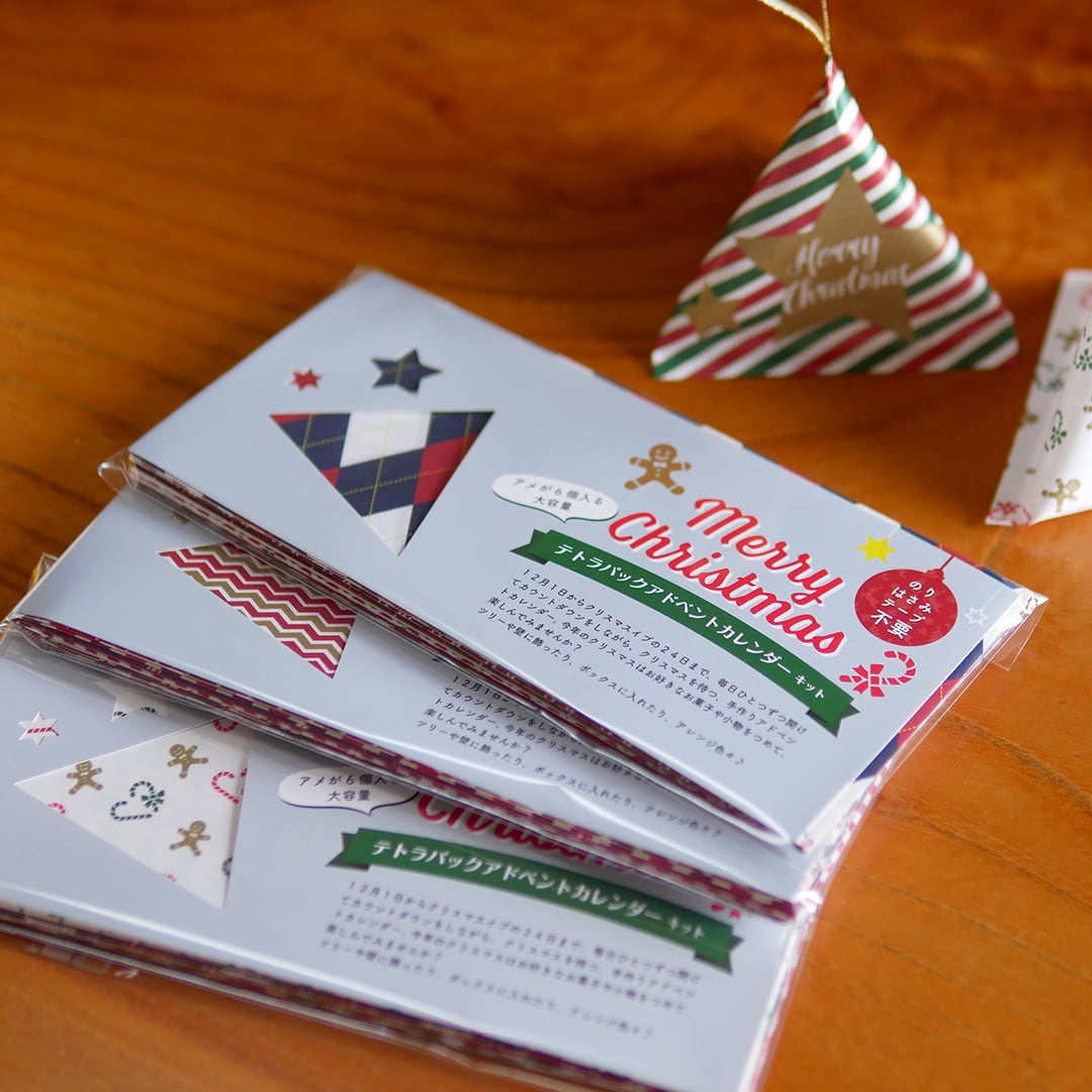 折り紙より薄い特殊な紙に12種類のクリスマスカラーデザインのテトラパックアドベントカレンダーを制作しました。印刷に特色のゴールドを使っているので、飾るだけでお部屋が華やかになります。